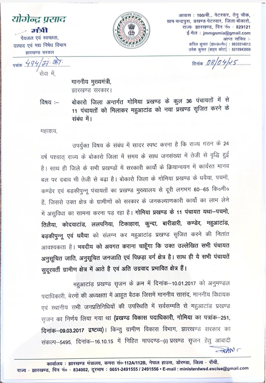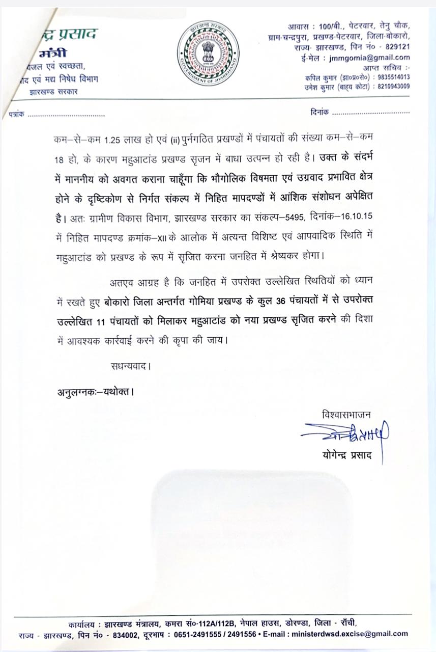 मुख्यमंत्री को सौंपे पत्र में मंत्री श्री प्रसाद ने कहा है कि राज्य गठन के 24 वर्ष पश्चात् राज्य के बोकारो जिला में समय के साथ जनसंख्या में तेजी से वृद्धि हुई है। साथ ही जिले के सभी प्रखण्डों में सरकारी कार्यों के क्रियान्वयन में कार्यरत मानव बल पर दबाव भी तेजी से बढ़ा है। बोकारो जिला के गोमिया प्रखण्ड के धवैया, पचमो, कण्डेर एवं बड़कीपुन्नू पंचायतों का प्रखण्ड मुख्यालय से दूरी लगभग 60-65 KM है, जिससे उक्त क्षेत्र के ग्रामीणों को सरकार के जनकल्याणकारी कार्यों का लाभ लेने में असुविधा का सामना करना पड़ रहा है। गोमिया प्रखण्ड के 11 पंचायत पचमो, तिलैया, कोदवाटांड, ललपनिया, टिकाहारा, कुन्दा, बारीडारी, कण्डेर, महुआटांड, बड़कीपुन्नू एवं धवैया को संलग्न कर महुआटांड़ प्रखण्ड सृजित करने की नितांत आवश्यकता है। अवगत कराया है कि उल्लेखित सभी पंचायत अनुसूचित जाति, अनुसूचित जनजाति एवं पिछड़ा वर्ग क्षेत्र है। साथ ही ये सभी पंचायतें सुदूरवर्ती ग्रामीण क्षेत्र में आते है एवं अति उग्रवाद प्रभावित क्षेत्र हैं।