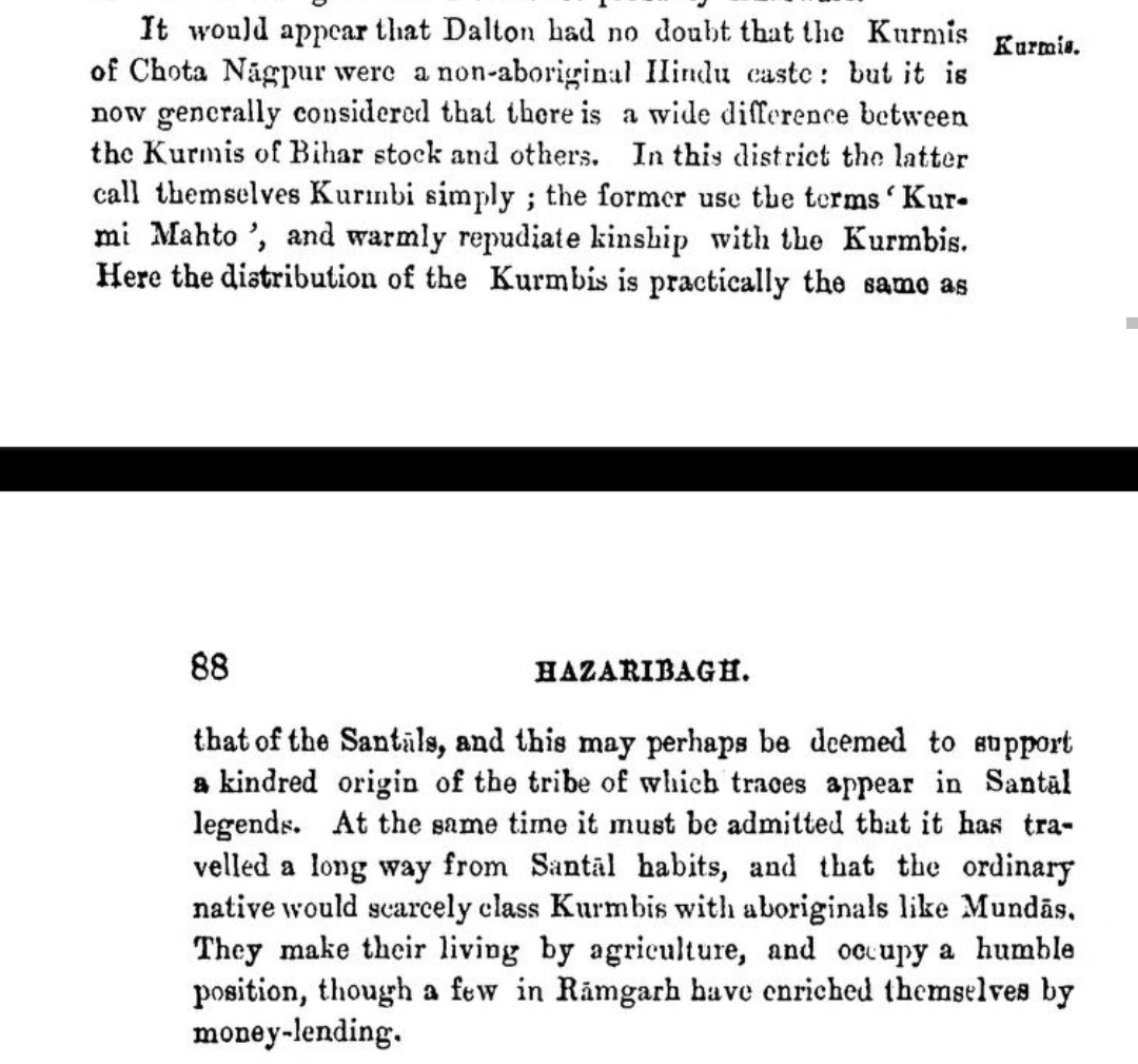 चेप्टर IV, ‘द पीपल’ पेज़ नं०- 87 में कहा गया है कि नृवंशविज्ञान सर्वेक्षणकर्ता एडवर्ड ट्यूट डाल्टन ने भी निंसंदेह छोटानागपुर के कुरमी को गैर-आदिवासी माना है। और बिहार के कुर्मियों के बीच बहुत अंतर बताया है। हजारीबाग जिले में बाद में आकर बसने वाले खूद को ‘कुनबी’ कहते हैं तथा पूर्व वाले ‘कुरमी-महतो’ शब्द का इस्तेमाल करते हैं, और कुर्म्बियों के साथ रिश्तेदारी को गर्मजोशी से नकारते है। यहां कुड़मियों का वितरण व्यावहारिक रूप से वैसा ही है जैसा संथालियों का। और यह जनजाति की समान उत्पत्ति का समर्थन करने वाला माना जाता है जिसके निशान संथाल किंवदंतियों में दिखाई देते हैं। लेकिन कुड़मि संथाल आदतों से बहुत दूर चला गया है। बता दें जनगणना सर्वेक्षण की शुरुआत ब्रिटिश औपनिवेशिक शासनकाल से ही शुरू हुआ है। 1871 में सबसे पहले व्यवस्थित और व्यापक जनगणना की शुरुआत हुई इसके बाद 1881,1891,1901,1911,1921,1931 व 1941 तक ब्रिटिश सर्वे हुए हैं। जिसमें छोटानागपुर के कुड़मि को एबओरिजिनल व प्रीमिटव ट्राइब्स के अंतर्गत रखा गया है।