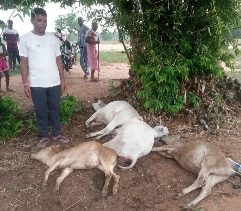 कसमार (बोकारो)। कसमार अंचल अंतर्गत सोनपूरा पंचायत के सिल्लीसाड़म में गुरूवार शाम करीब चार बजे तेज बारिश के साथ वज्रपात होने से 5 मवेशियों की मौत घटना स्थल पर ही हो गई। बताया जा रहा है कि सभी मवेशी सोनपूरा पंचायत के सिल्लीसाढ़म निवासी सर्वेश्वर हांसदा की है। पीड़ित सर्वेश्वर हांसदा ने बताया कि जंगल की और से सभी मवेशी घर आने के क्रम में विष्णुटाॅड़ फुटबॉल मैदान के पास एक बांस की झाड़ी पास पहुंचे ही थे कि अचानक बारिश होने लगी उसी बीच तेज़ वज्रपात से 5 गाय व 1बैल की मौत घटना स्थल पर हो गयी। किसान ने सोनपूरा पंचायत के मुखिया चन्द्रशेखर हेम्ब्रम को वज्रपात से मवेशी की मौत की सूचना दी गई। सूचना पाते के साथ मवेशी की जायजा ली और घटना स्थल से ही कसमार सीओ प्रवीण कुमार, कसमार थाना प्रभारी भजनलाल महतो तथा कसमार के भ्रमणशील पशु चिकित्सा पदाधिकारी डाॅo अखौरी को जानकारी देते हुए मुआवजा की प्रकिया करने की मांग की। मौके पर घटना स्थल पर पशु चिकित्सक जितेन्द्र टुडू, नंदन हेम्ब्रम, श्यामसुंदर मरांडी, भीम टुडू, नकुल टुडू, सहित कई ग्रामीण मौजूद थे।