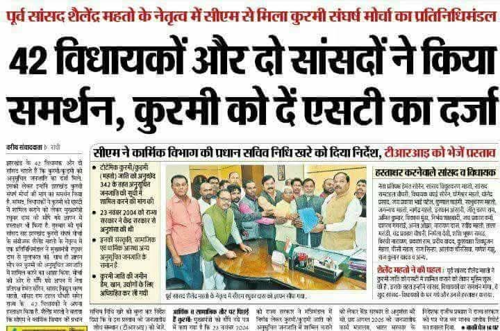 रांची। झारखंड विधानसभा के तत्कालीन नेता प्रतिपक्ष हेमंत सोरेन सहित 42 विधायक व 2 सांसदों ने कुड़मि जाति को ST (अनुसूचित जनजाति) का दर्जा दिये जाने के समर्थन पत्र पर हस्ताक्षर किया था। पूर्व सांसद शैलेन्द्र महतो के नेतृत्व में कुड़मि संघर्ष मोर्चा का प्रतिनिधिमंडल तत्कालीन मुख्यमंत्री रघुवर दास से मिलकर समर्थन पत्र का ज्ञापन सौंपते हुए कुड़मि को एसटी का दर्जा देनी की मांग थी। इसपर मुख्यमंत्री रघुवर दास ने उक्त प्रस्ताव को जनजातिय शोध संस्थान (TRI) को भेजने के लिए कार्मिक विभाग की प्रधान सचिव निधि खरे को बुलाकर निर्देश दिया था। पूर्व सांसद शैलेन्द्र महतो ने तत्कालीन अर्जुन मुंडा की सरकार द्वारा कुड़मि जाति को अनुसूचित जनजाति की सूची में शामिल करने की मांग को लेकर 24 नवंबर 2004 को राज्य मंत्रीमंडल ने निर्णय लेकर भारत सरकार के जनजातिय कार्य मंत्रालय को अनुशंसा भेजा था। इस पर निदेशक भारत सरकार राजीव प्रकाश ने छः अगस्त 2005 को झारखंड सरकार के जनजातीय शोध संस्थान से मानव जातिय रिपोर्ट की मांग की थी। जिसका हवाला भी दिया था।