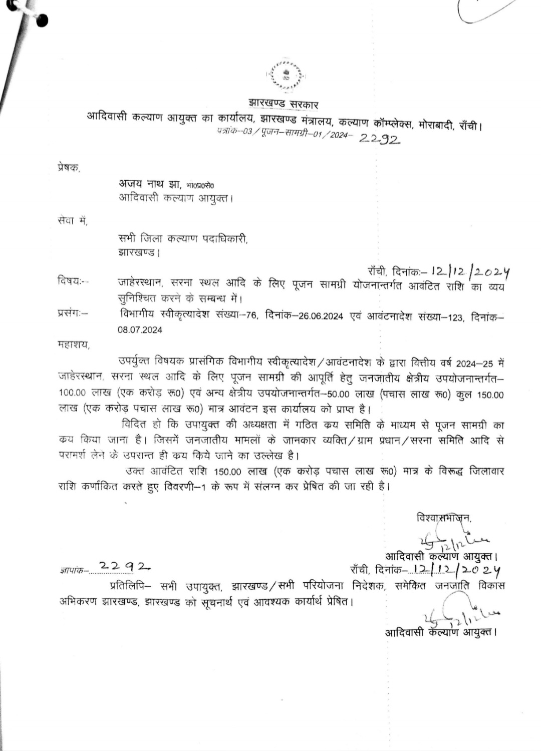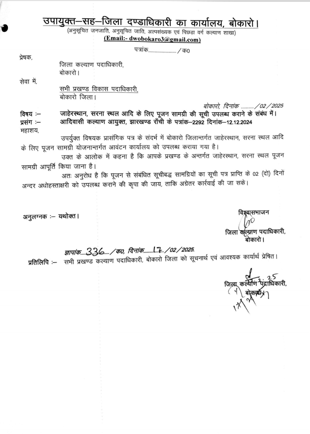 बोकारो। जनजातीय संस्कृति की पारंपरिक पूजा-पासा अनुष्ठानों को बरकरार रखने हेतु झारखंड सरकार द्वारा सभी जनजातीय गांवों में स्थित सरना स्थल व जाहिर थानों में पूजन अनुष्ठान हेतु सहयोग किया जायेगा। इस निमित्त झारखंड सरकार कल्याण विभाग की ओर से सभी जनजातीय गांवों के ग्राम प्रधान, मांझी हड़ाम,पाहन, नेइया तथा जनजातीय मामलों के जानकार व्यक्ति, सरना समिति या सदस्यों से संपर्क स्थापित कर पूजन सामग्रियों की सूची मांगी गयी है। बोकारो जिला में भी जिला कल्याण पदाधिकारी ने भी चास, चंदनकियारी, जरीडीह, चंद्रपुरा, नावाडीह , बेरमो, गोमिया, पेटरवार व कसमार